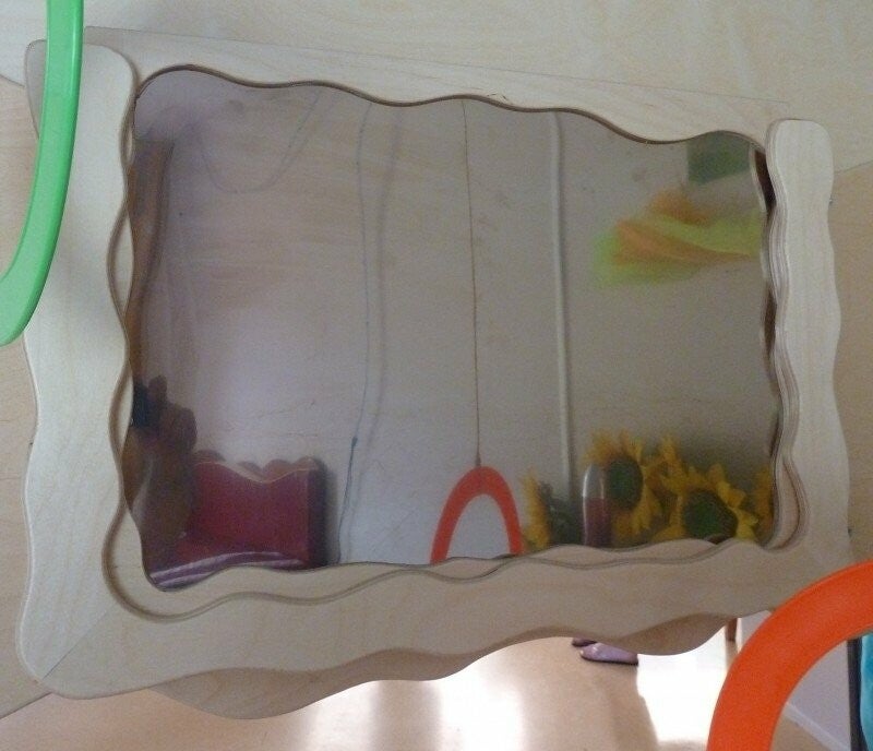 Speelplaat bestaande uit twee dunne lagen gelakt multiplex met daartussen verlijmd een polycarbonaat spiegelplaat. De voorste houten plaat heeft een organische vorm.