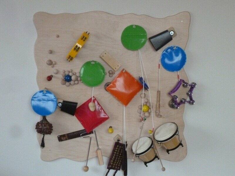 Muziek- voel- wandpaneel met muziekinstrumenten die zowel rechtstreeks maar ook verend zijn gemonteerd. Hierdoor zijn ze met de hand of met een stokje te bespelen en geven ze bijzondere acoustische effecten. Tevens is er een tactiel ballenparcours van rubber en hout.